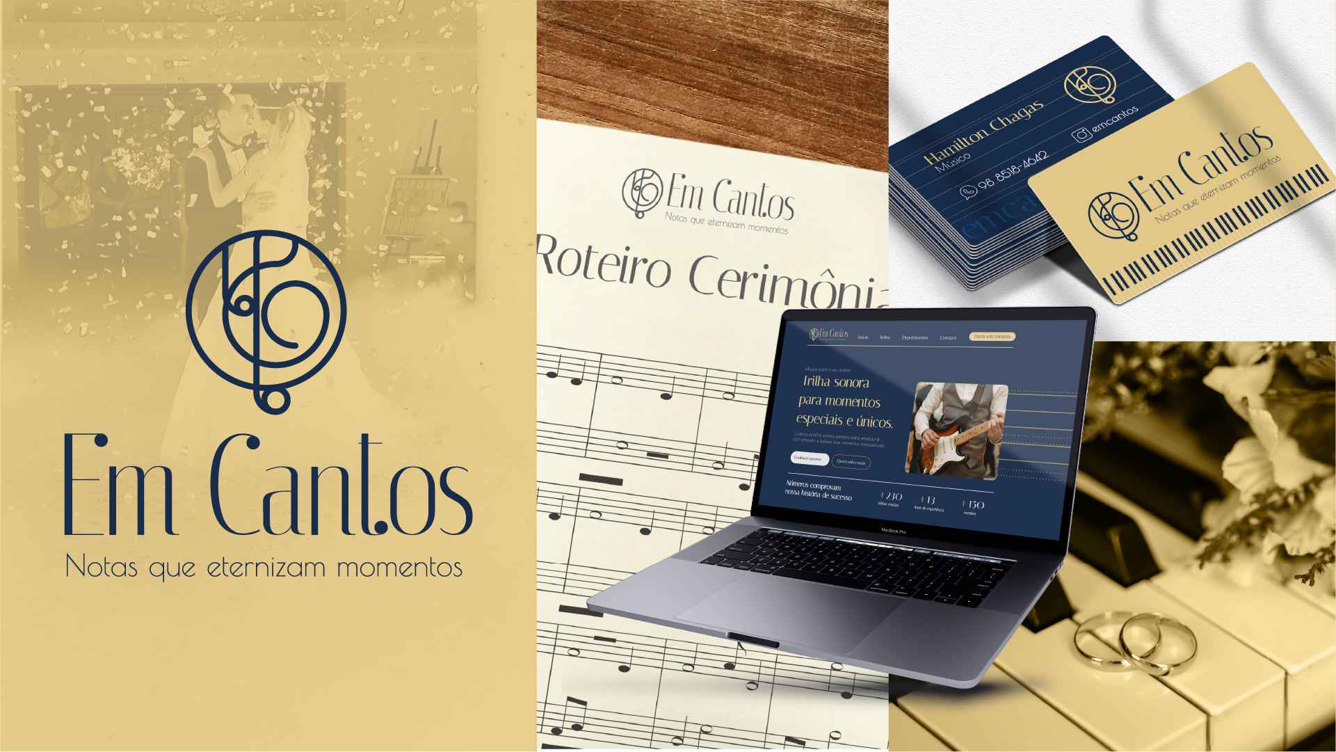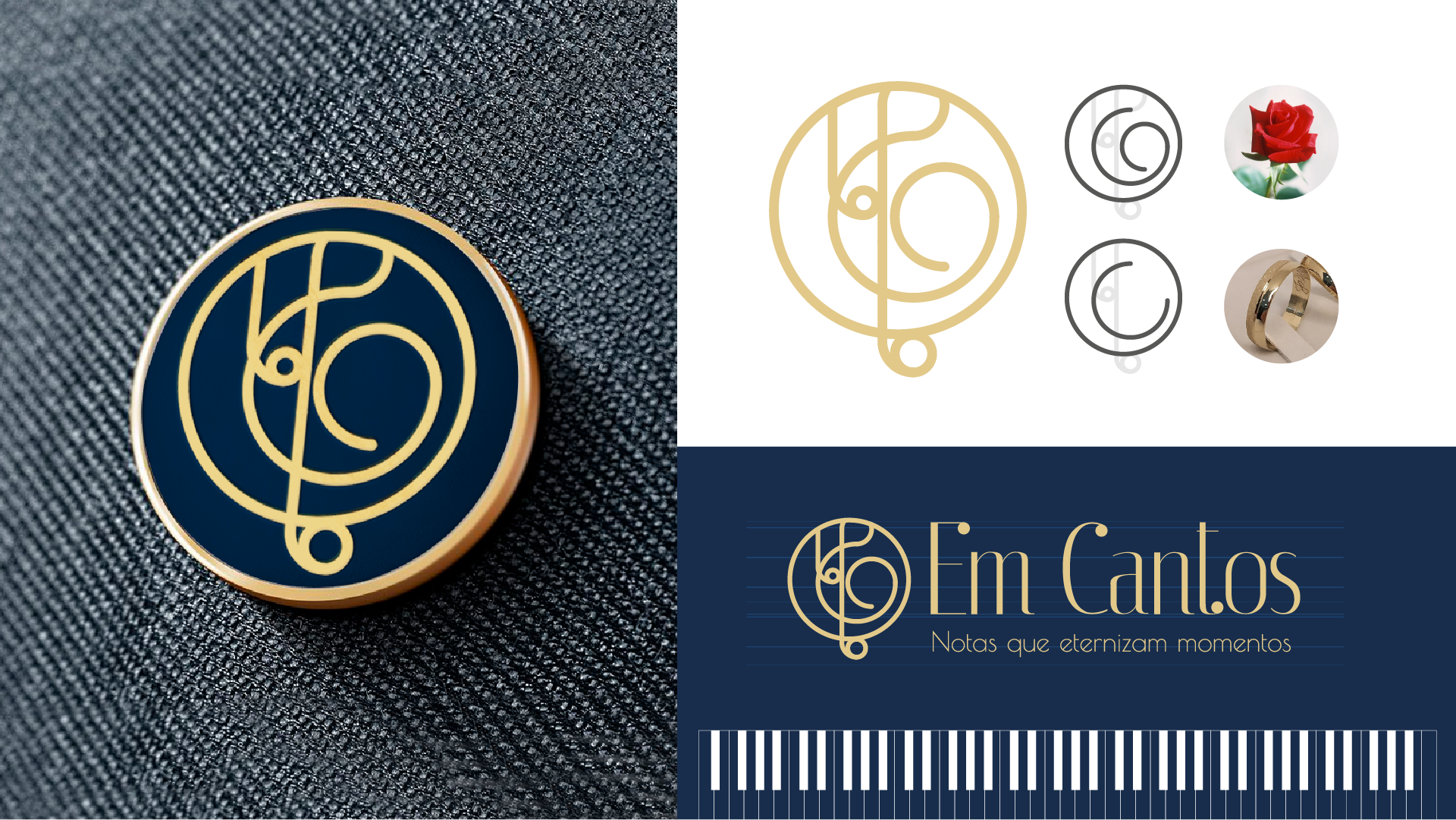 Em Cantos é uma empresa dedicada a transformar momentos especiais em experiências inesquecíveis por meio da música. Atuamos em uma ampla variedade de eventos, incluindo casamentos, formaturas, aniversários, cultos ecumênicos e festas privadas, oferecendo um toque único de sofisticação e emoção. A criação da identidade visual envolveu o mapeamento dos assets visuais que localizam a marca no universo de atuação de forma envolvente e harmoniosa, sendo fundamental a criação de um símbolo inédito que transmita um sentimento de encantamento, elegância e felicidade.
